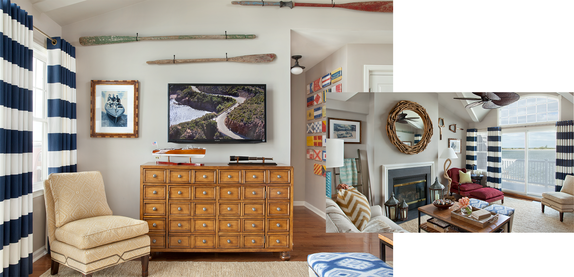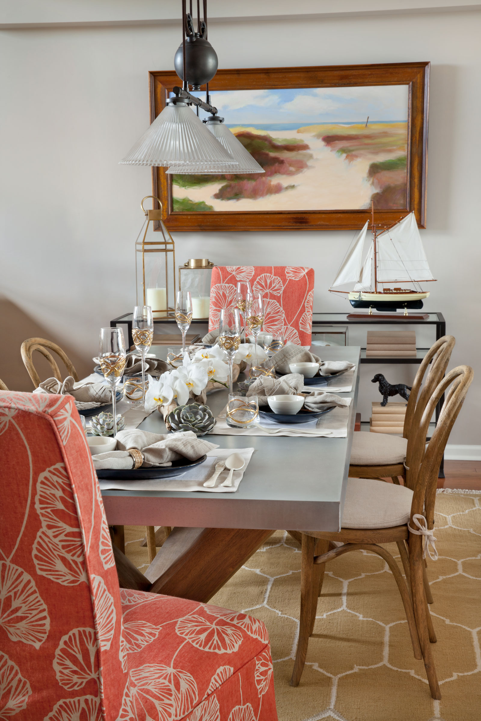 For Susan and Daniel, a couple entering a new chapter in retirement, this bayside home celebrates ease, color, and connection. The design embraces a refined coastal sensibility—soft neutral backgrounds layered with vibrant fabrics, art, and collected décor. Subtle nods to the island’s fishing heritage add authenticity without resorting to theme, creating a home that feels both classic and contemporary. Spaces flow easily between relaxed daily living and effortless entertaining, reflecting the couple’s love of tennis, friends, and a bright, welcoming home. The result is a retreat that feels timeless, personal, and full of life—a colorful reinterpretation of the Ralph Lauren coastal spirit.